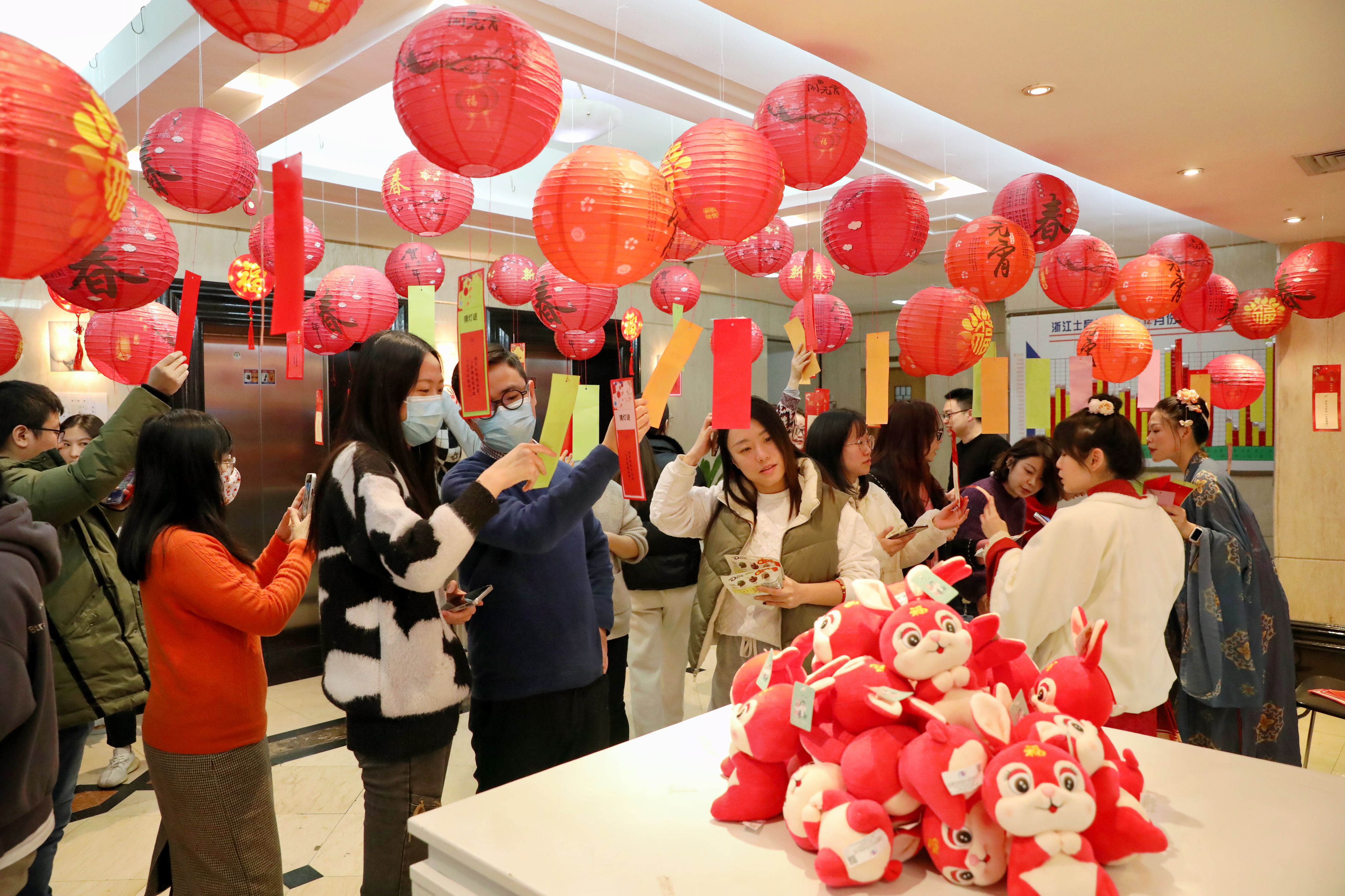 2月3日中午,浙江土畜工會組織開展元宵猜燈謎活動,公司三樓人頭攢動、熱鬧非凡,廳里錯落別致懸掛了一盞盞喜慶的紅燈籠,燈下都有五光十色的謎箋,吸引了許多員工駐足競猜,有的看著謎面低頭沉思,有的與同伴相互討論,領(lǐng)獎桌旁也是絡(luò)繹不絕。紅紅火火燈籠與熙熙攘攘的人群交相輝映,洋溢著濃濃的“土畜年味兒”。